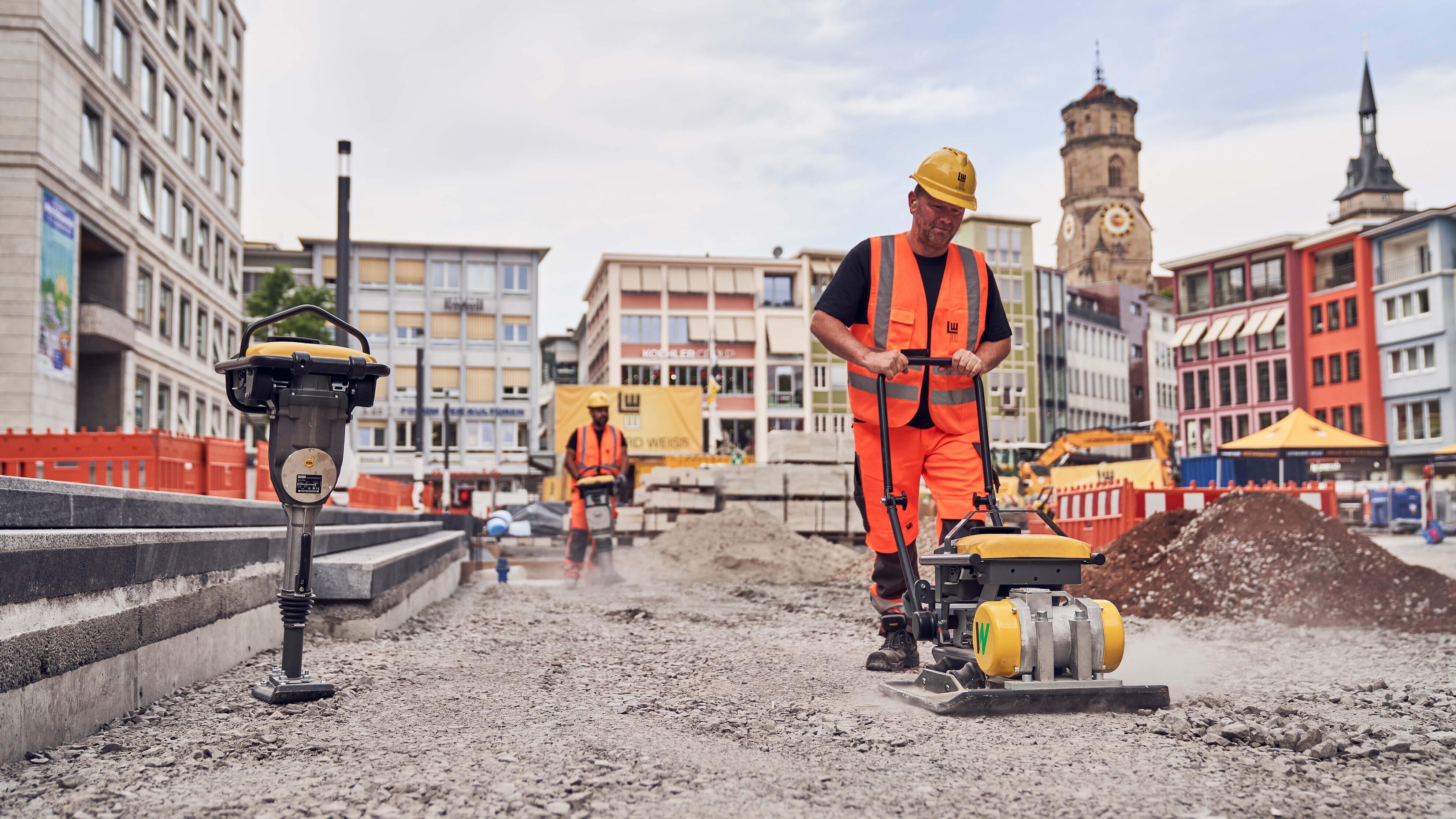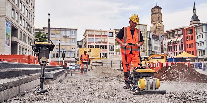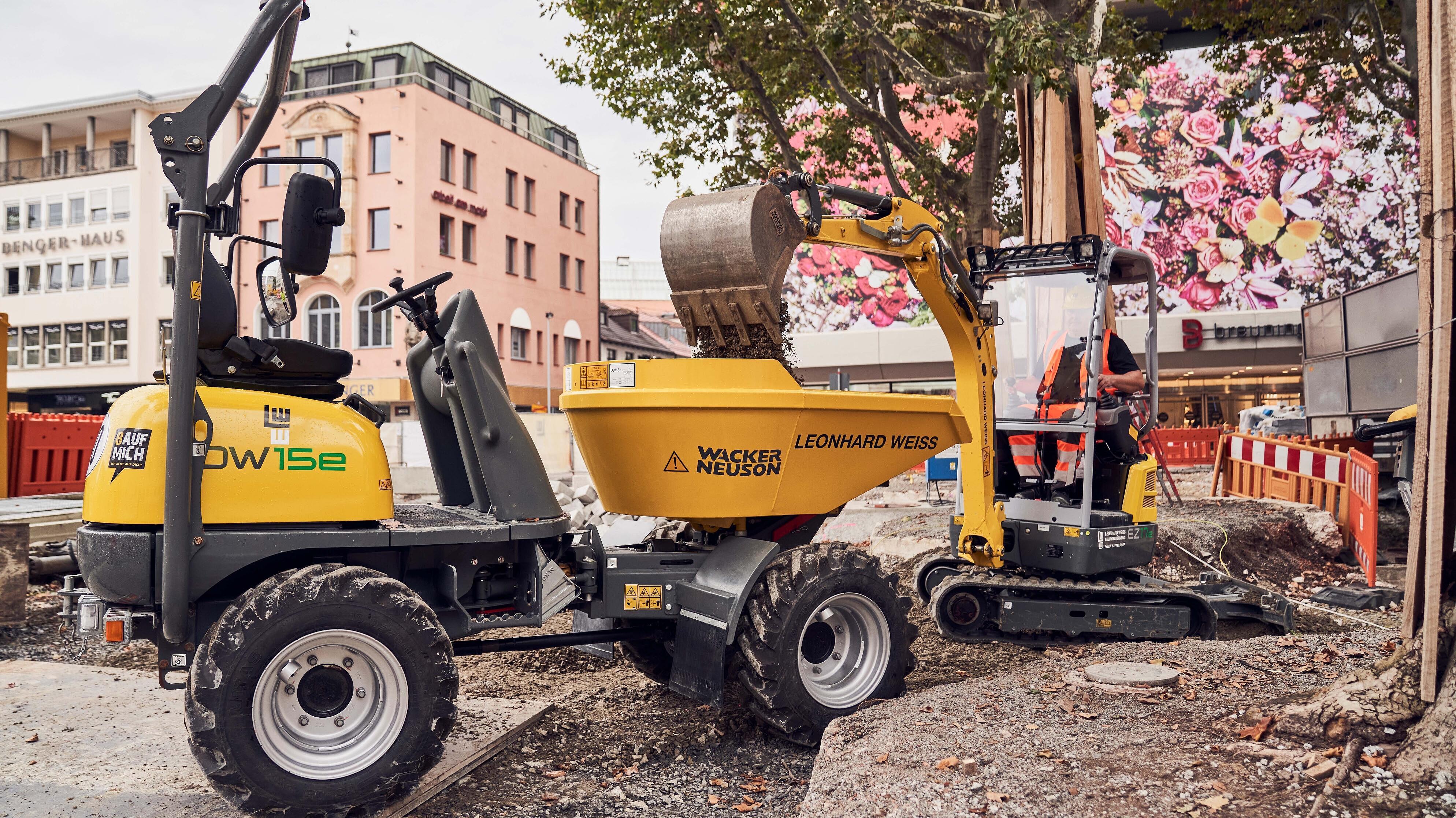 Na stavbě ve Stuttgartu byly použity akumulátorové pěchy a akumulátorové desky, které se na trhu osvědčily od roku 2015 mimo jiné z nové řady pro hutnění půdy APS. Pásové dumpery DT10e, kolový dumper DW15e a kolový nakladač WL20e umožnily efektivní přepravu materiálu bez přímých výfukových emisí a s extrémně nízkými emisemi hluku. Pro výkopové a demoliční práce bylo k dispozici rýpadlo Zero Tail EZ17e. Díky vysoce kvalitní lithium-iontové technologii splňuje stroj vysoké nároky na výkon, odolnost a robustnost.