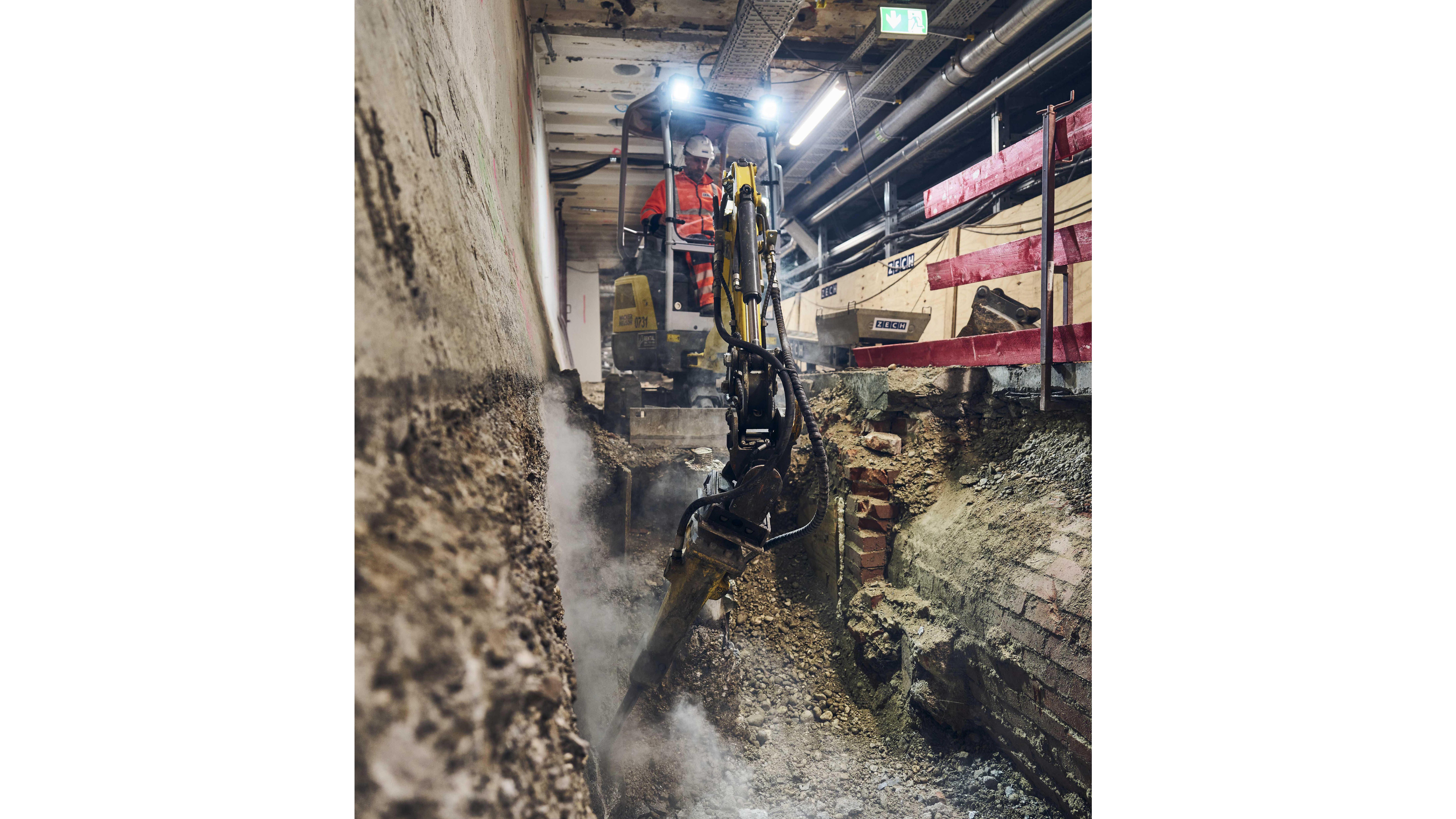 Při demoličních pracích a výkopu materiálu byla v nepřetržitém provozu použita dvě elektrická akumulátorová minirypadla EZ17e. Tyto stroje musely celkově přemístit více než 600 metrů krychlových materiálu ve velmi stísněných prostorách. Díky kompaktní konstrukci a absenci zadního přesahu je minirypadlo EZ17e pro tyto práce ideální a podává stejný výkon jako jeho palivem poháněný protějšek. Pracovní prostředí je pro všechny přítomné pracovníky i obsluhu mnohem příjemnější, jelikož jsou přímé emise výfukových plynů i hluk sníženy na minimum. K transportu materiálu byl použit akumulátorový teleskopický nakladač TH412e. Díky své kompaktní konstrukci je ideální pro použití v interiéru. Úzké podzemní pasáže na Hlavním nádraží nepředstavovaly pro kompaktní model s rozměry necelé dva krát dva metry žádný problém.